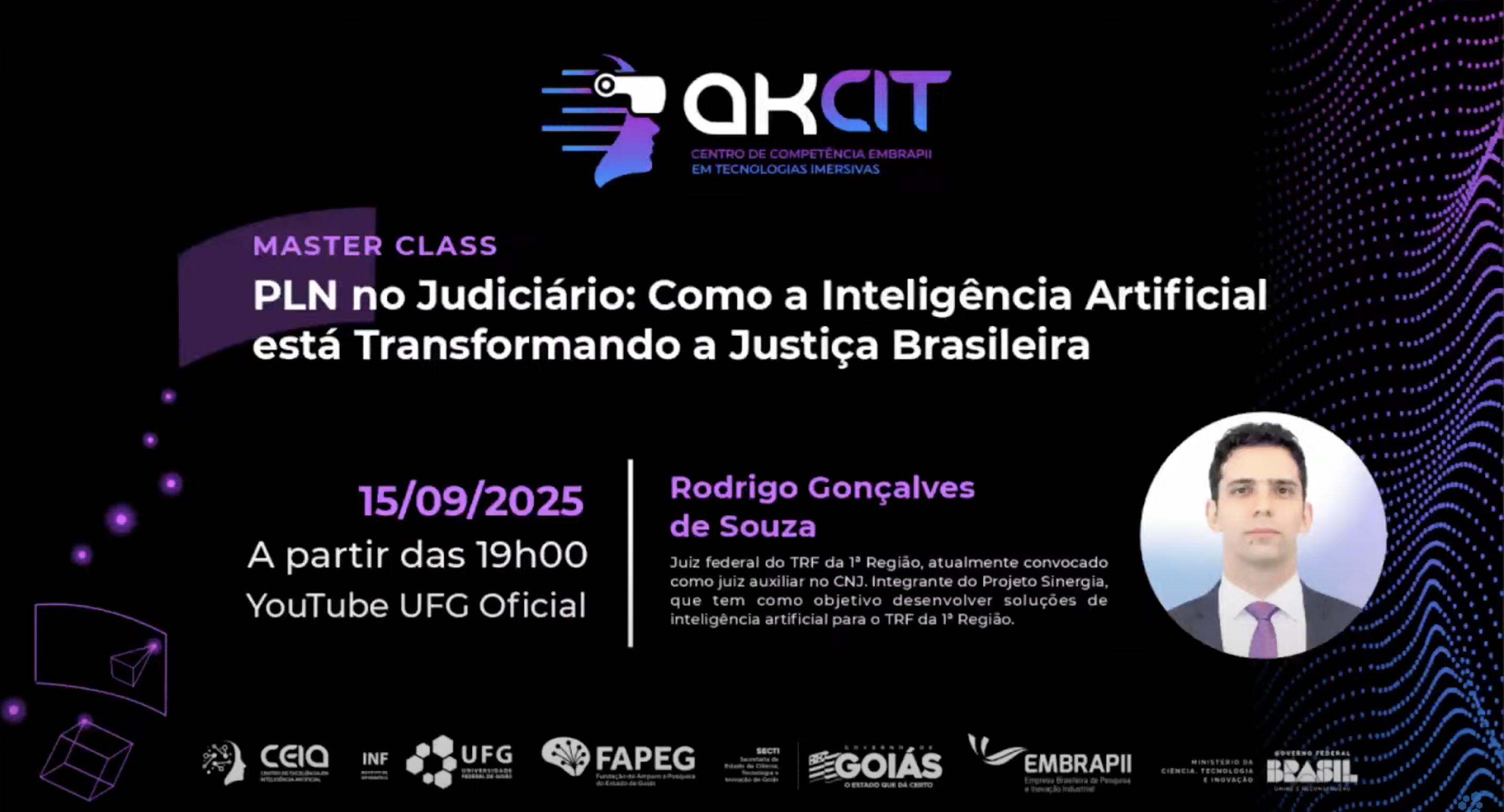Na noite do dia 15 de Setembro de 2025, durante uma transmissão ao vivo no YouTube UFG Oficial, conhecemos os novos integrantes da terceira turma da Especialização em Processamento de Linguagem Natural (PLN), promovida pelo Centro de Competência Embrapii em Tecnologias Imersivas (AKCIT), que é vinculado ao Instituto de Informática (INF/UFG). Os participantes do curso agora integram os mais de dois mil estudantes que compõem o quadro do INF/UFG, como pontua Sérgio Teixeira, diretor do instituto.
